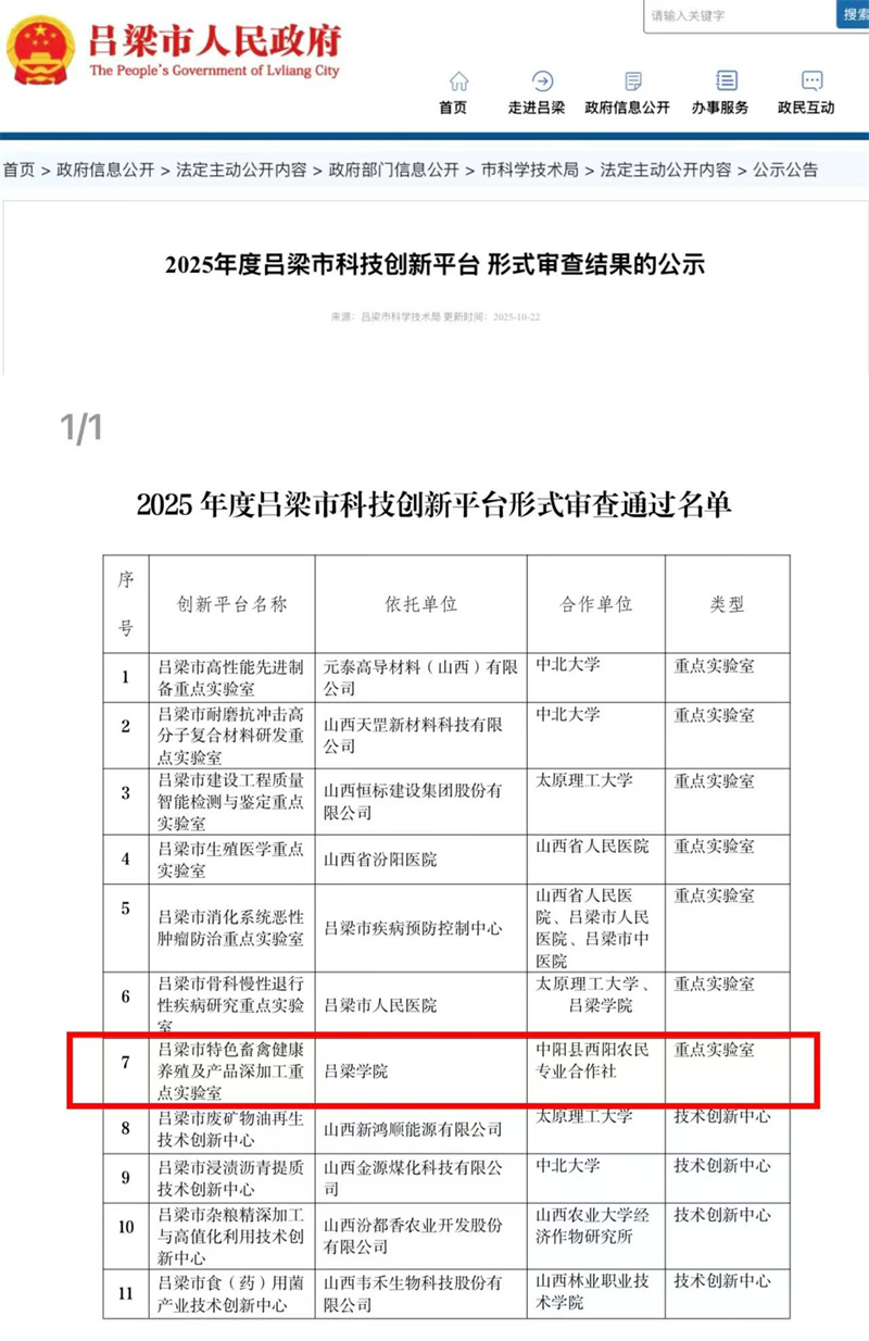 近日,吕梁市科学技术局公布《关于2025年度吕梁市科技创新平台建设拟立项名单的公示》项目名单,由我系申报的创新平台项目“吕梁市特色畜禽健康养殖及产品深加工重点实验室”成功获批。