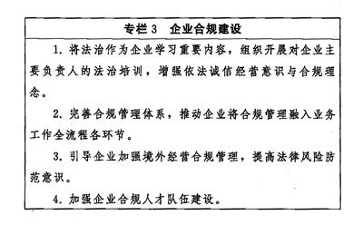 深化依法治企。深化“法律进企业”,落实经营管理人员学法用法制度。加强企业法治文化建设,提高经营管理人员依法经营、依法管理能力。推动企业合规建设,防范法律风险,提升企业管理法治化水平。