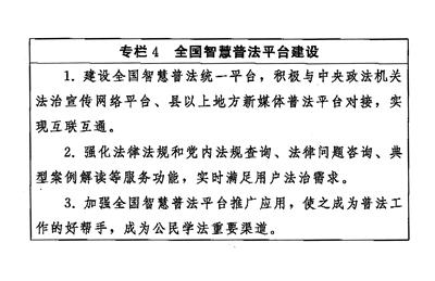 拓展普法网络平台。以互联网思维和全媒体视角深耕智慧普法。强化全国智慧普法平台功能,推动与中国庭审公开网、中国裁判文书网等网络平台的信息共享。建立全国新媒体普法集群和矩阵,发挥“学习强国”等平台优势,形成多级互动传播。建设全国统一的法律、法规、规章、行政规范性文件、司法解释和党内法规信息平台,及时更新数据,免费向公众开放。