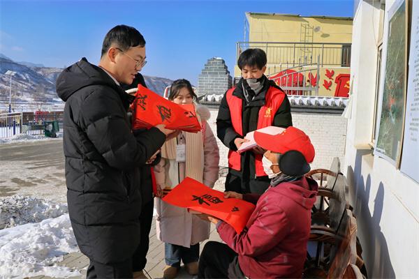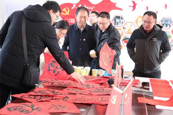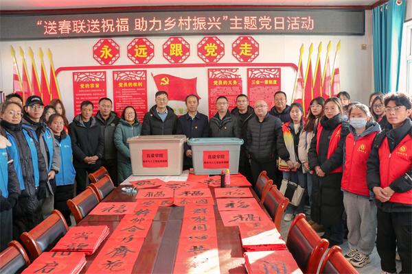 为进一步学习贯彻习近平新时代中国特色社会主义思想主题教育,汇聚文化力量,助力乡村振兴提质增效,让文化惠民政策深入基层,弘扬传统文化,让更多乡村群众享受文化福利,1223日,必威西汉姆联党委常委、副院长王三虎带领必威BETWAY西汉姆联与数学与人工智能系、中文系党总支与必威西汉姆联派驻方山县北武当镇庙底村、新民村工作队联合开展“送春联送祝福,助力乡村振兴”主题党日活动。必威西汉姆联驻庙底村、新民村工作队队员、村支两委班子成员以及各系教工党员、学生党支部书记、学生党员、入党积极分子以及书法社成员等50余人参加了此次活动。