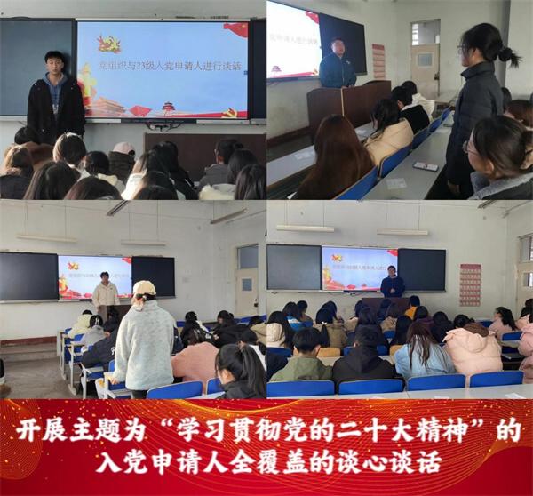 此次谈话以“树立正确入党动机、端正入党态度”为主题,以学习宣传贯彻党的二十大精神为要点,通过“党是什么”、“我的入党动机”、“对于党的二十大精神理解与感悟”、“对于日后生活学习上的规划”等内容让大家全面了解了党的基本知识、入党条件、要求、程序等,同时在宣传党的二十大精神的基础上引导学生树立正确的入党动机,端正入党态度。