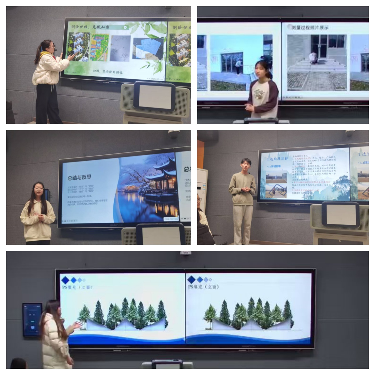 本次汇报以“从测绘到成图,从理论到实践 ”为主线,各小组通过多媒体演示、现场讲解、图纸展板及实物模型等多种形式,系统展示了从实地样地测绘、手绘草图构思,到运用AutoCAD 精准绘制平面图与立面图,再到利Photoshop 等软件完成效果图渲染与图纸排版的完整设计流程。作品不仅体现出扎实的专业技能,更彰显了学生对园林空间逻辑、功能布局与美学表达的深入理解。